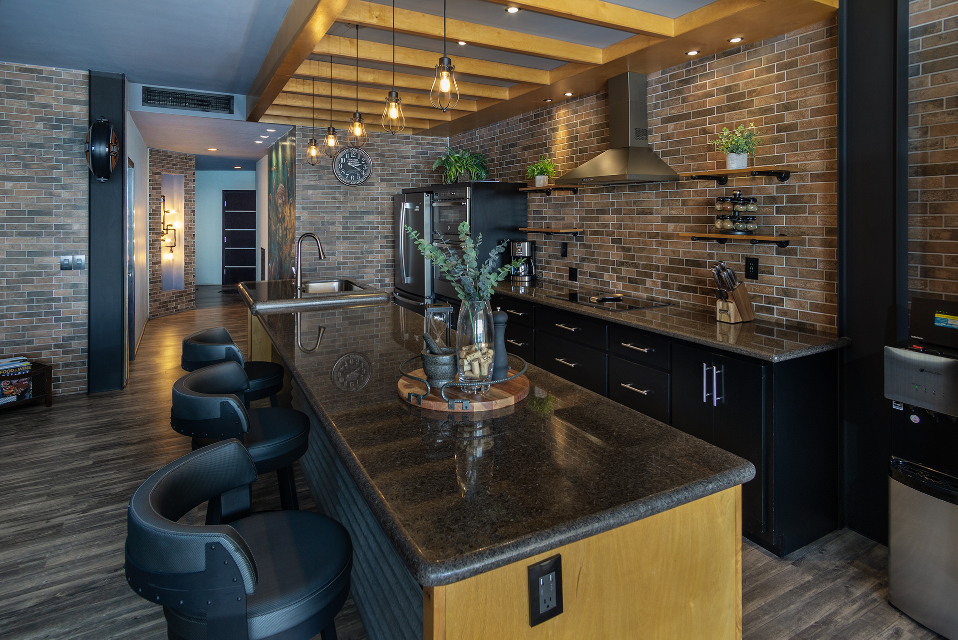 Known as Steampunk, this style combines elements of industrial along with whimsical details like pressure guages and iron pipes for lighting structures. This unit takes the standard floor plan of the Sonoran Sun and modifies the Master Bedroom as well. The glass shower stall is oriented to face into the bedroom here.