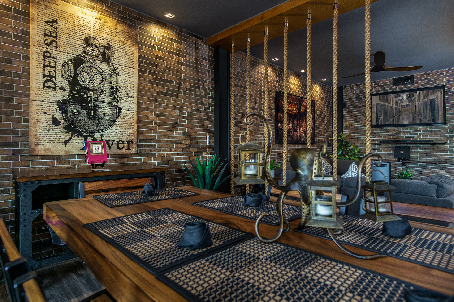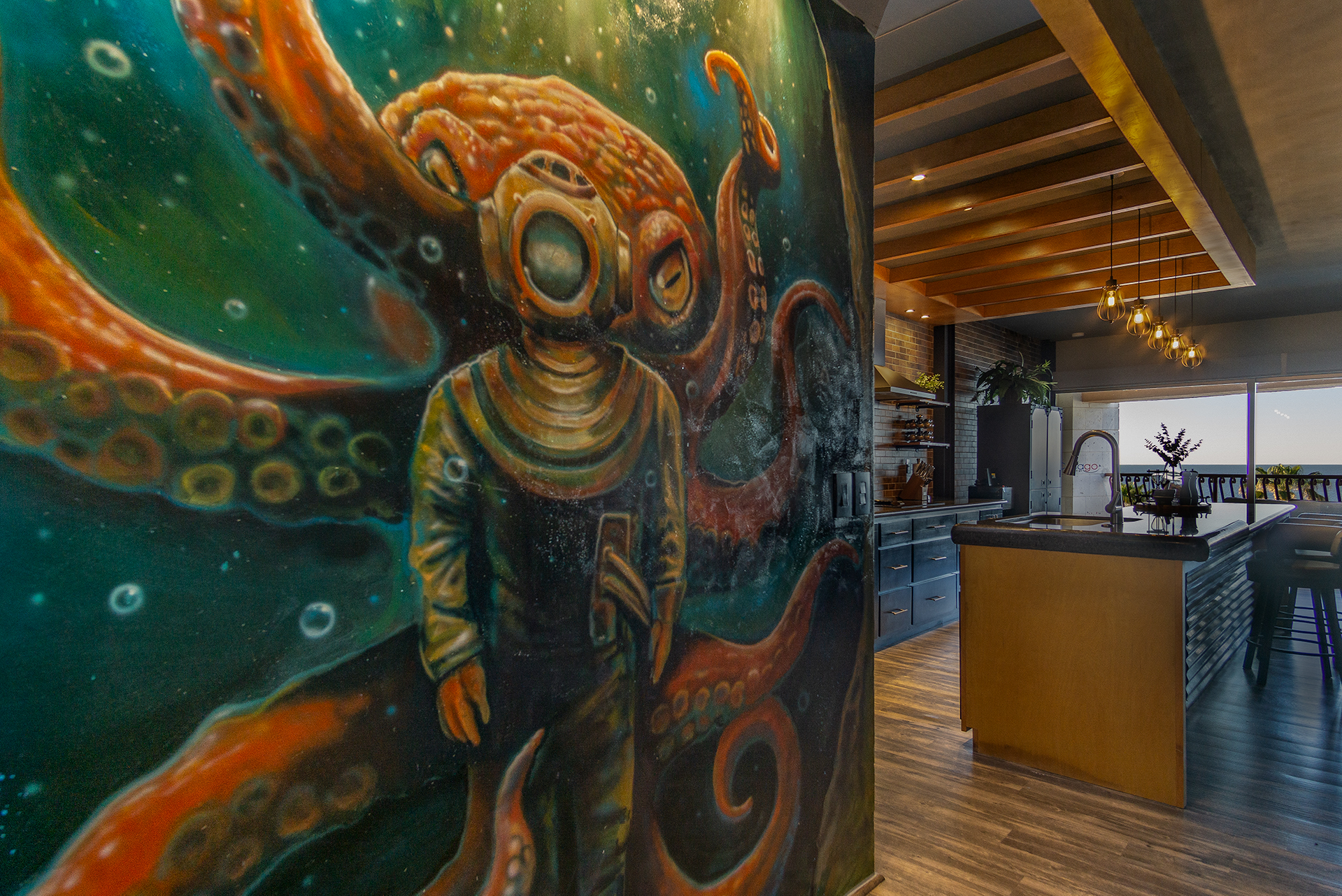 A long kitchen counter and high end appliances make a beautiful use of the main room. Dark tones, in brick and wood flow from room to room, all in the same style. Being at the ocean, the condo has nautical elements too. The centerpiece of the unit is a beautiful painting of a diver about to meet a mysterious fate at the ‘hands’ of a giant octopus. The work is by international artist Memuco, a Rocky Point native.