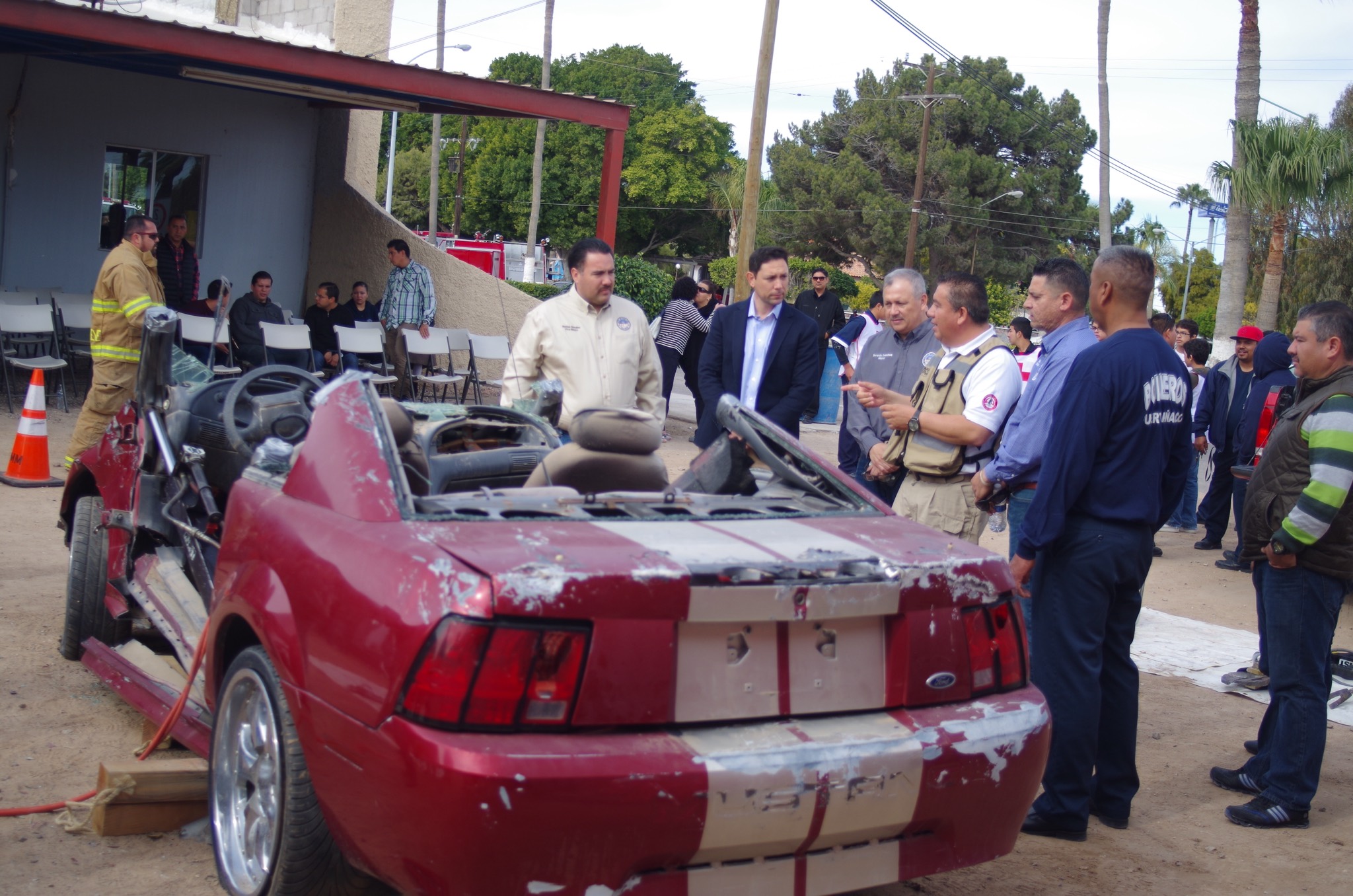 In a yard next to the Fire Station on Freemont Blvd, the ‘Bomberos’ went to work on a Ford Mustang that had been salvaged from a roll-over accident. To the sound of gas generators, two groups of men worked to remove the doors, the roof, and to pry open the vehicle. Working quickly, the car was completely open in a short time.